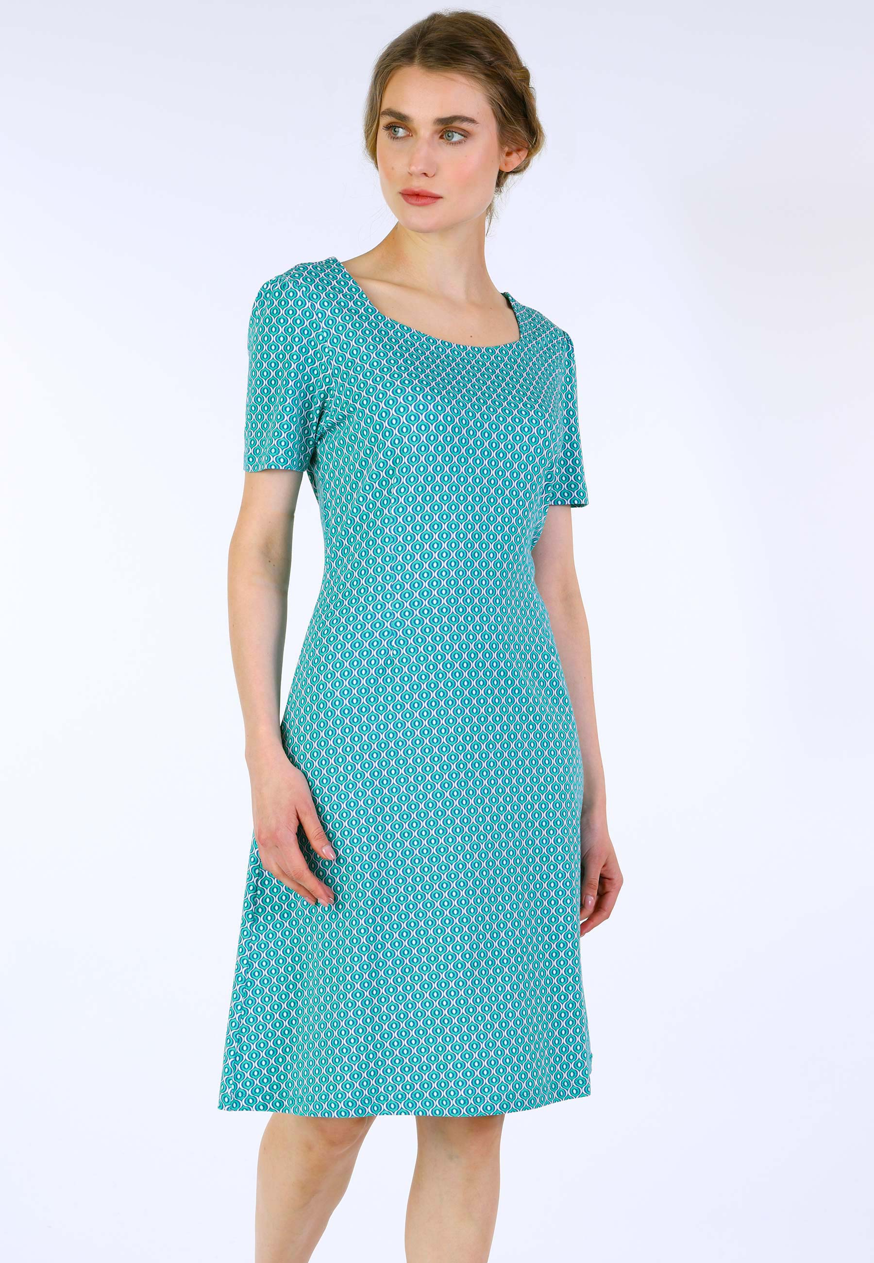 Our pretty Imani dress has a square neckline. The dress has modern puff sleeves and the subtle darts create a feminine waist. In addition, the soft and sustainable jersey quality ensures a pleasant wearing comfort and comes in a great geo print.