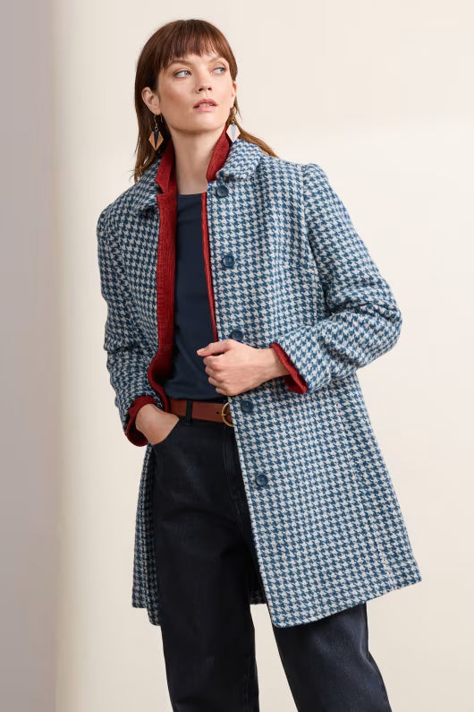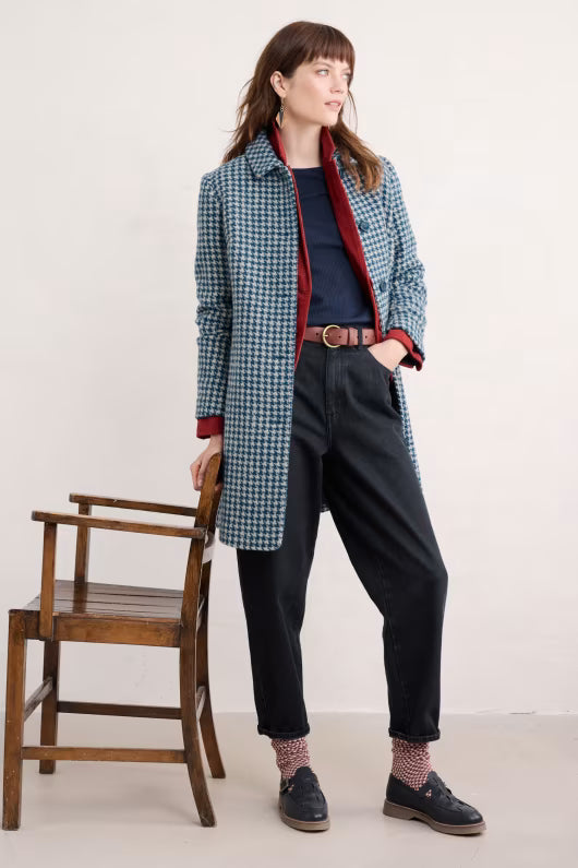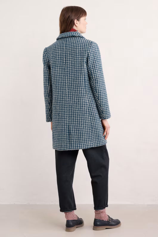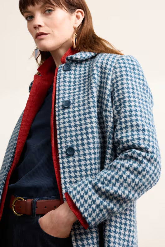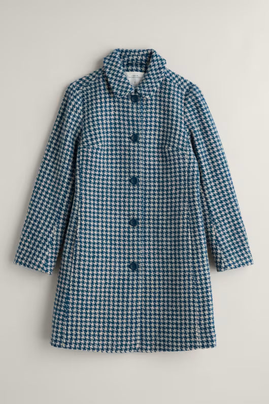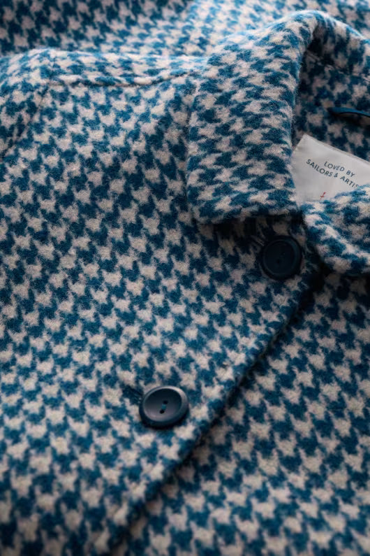 Wood Bird Mantel in Blaugrau – Ein zeitloser Wollmantel gefertigt aus einer warmen und strapazierfähigen Garnmischung mit recycelter Wolle. Vollständig gefüttert, bietet er klassische Details wie ein elegantes Hahntrittmuster, geräumige seitliche Eingrifftaschen, Knopfverschlüsse und eine leichte A-Linie unterstreichen sein hochwertiges Design. Dieser schöne Mantel ist ein idealer Begleiter für kühle Tage und verleiht jedem Outfit einen Hauch von Eleganz.