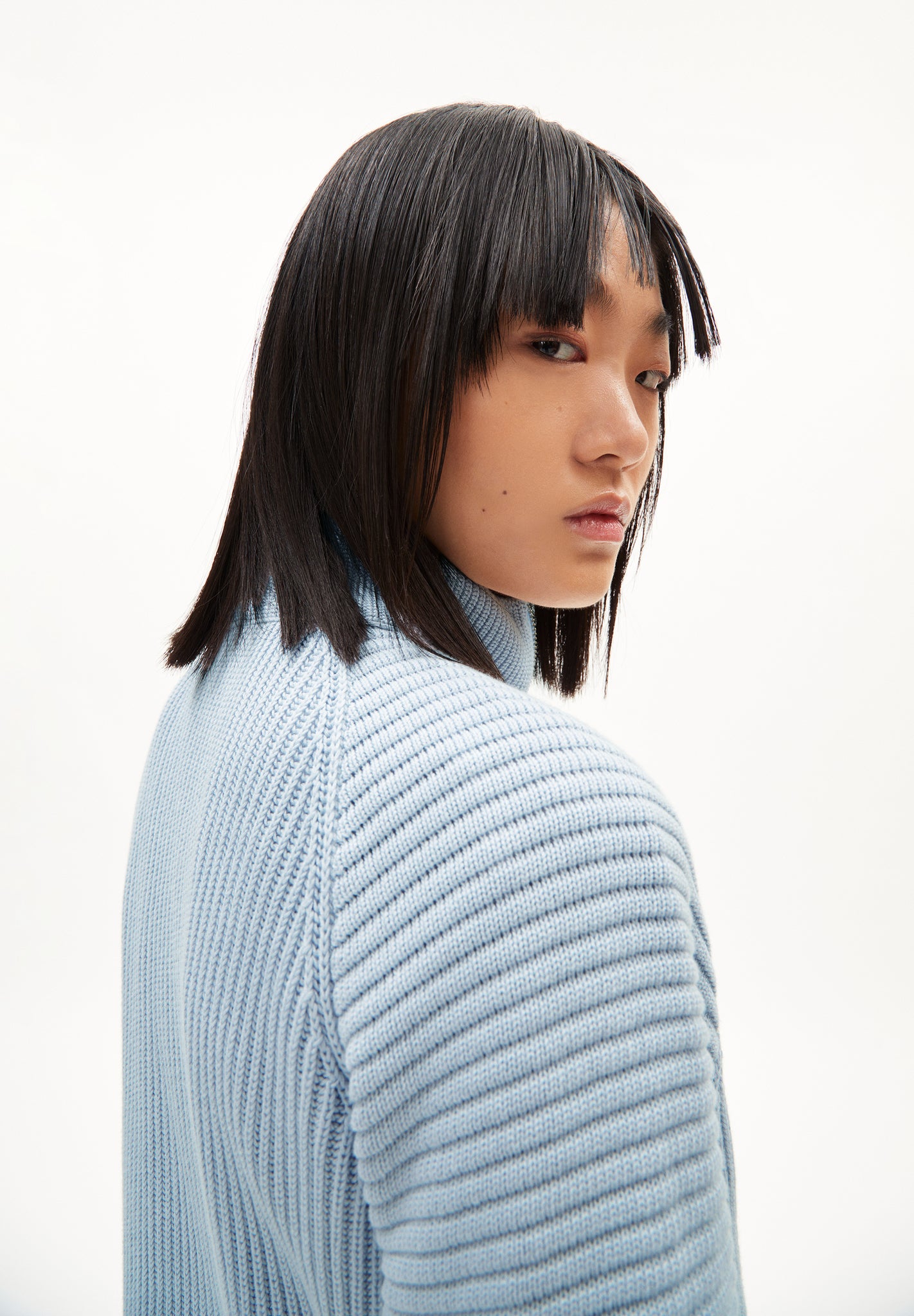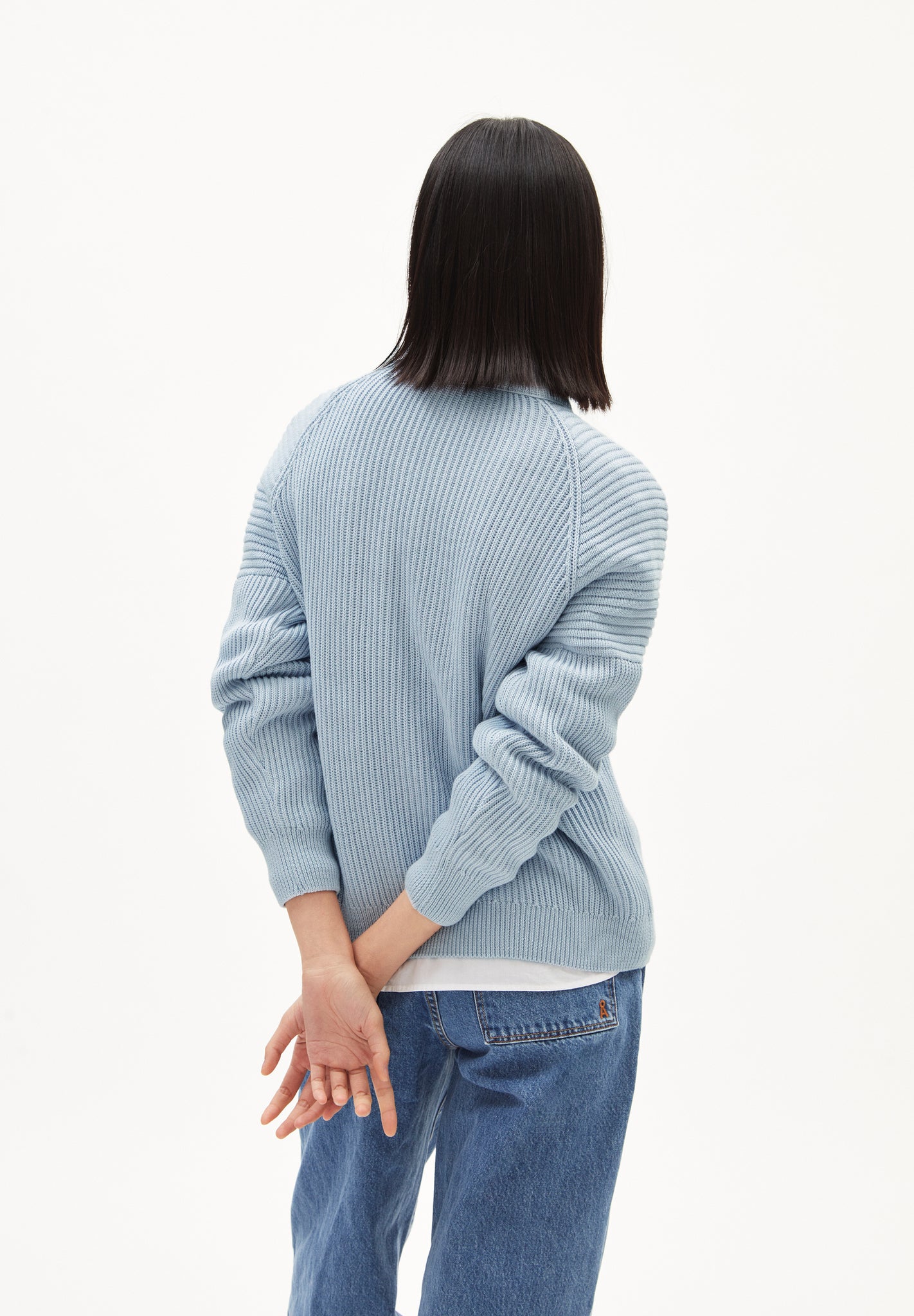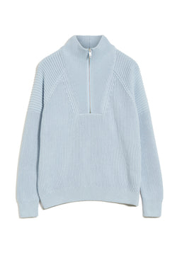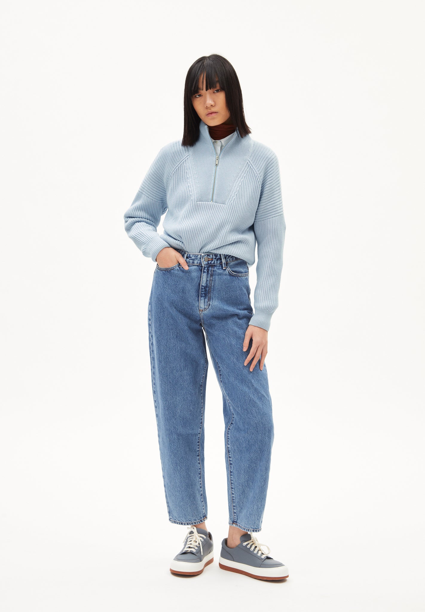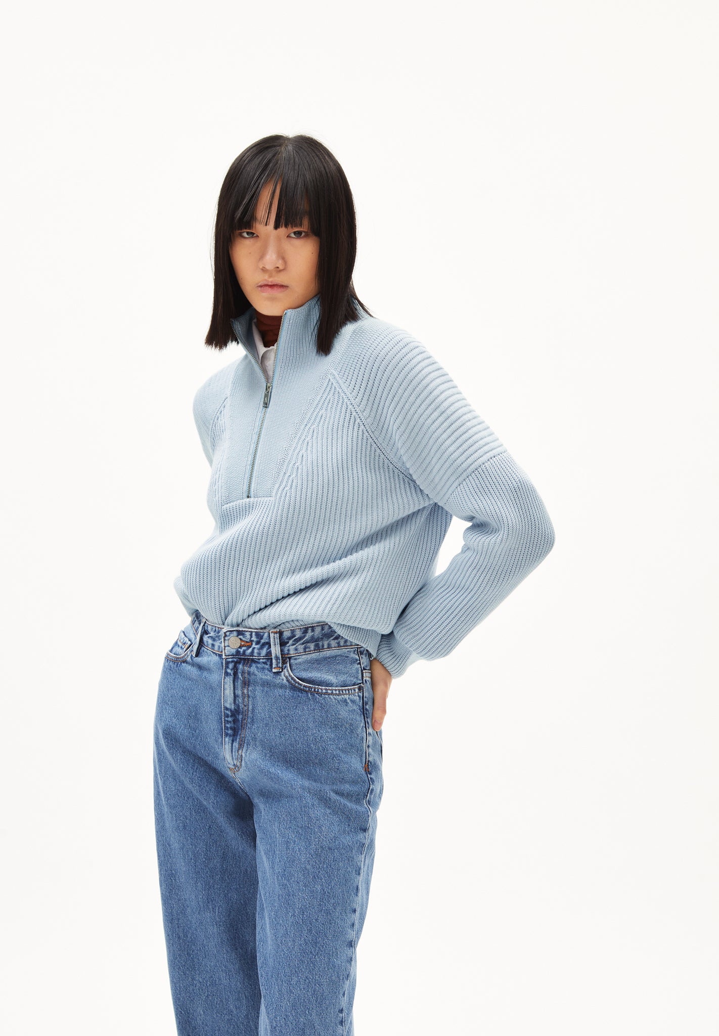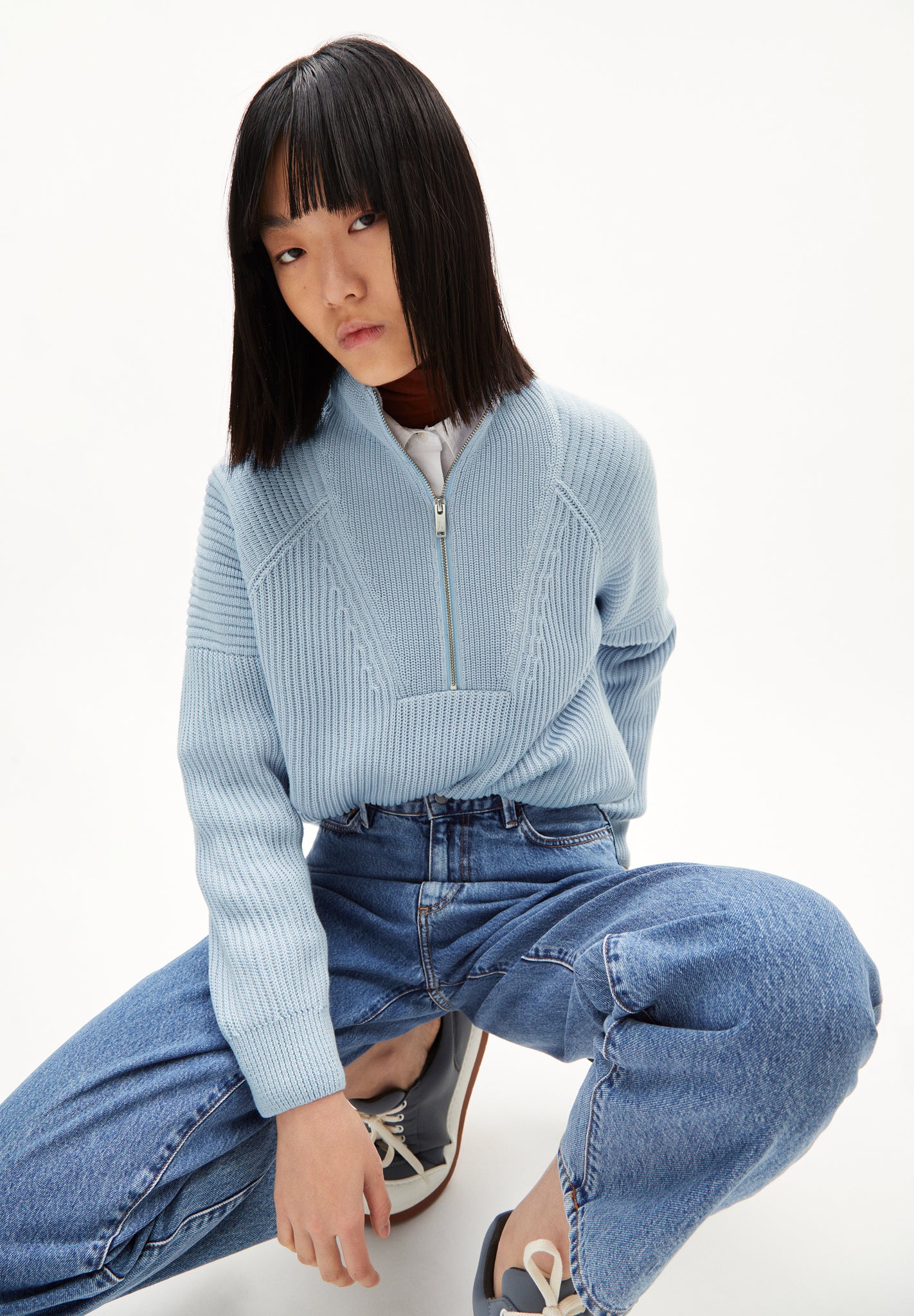 Schöner Strickpullover aus reiner Biobaumwolle. Der Troyer hat einen Kragen mit Zipper. Durch seine Loose Fit form fühlt man sich rundum wohl. Idealer Kombipartner sowohl zur Hose, als auch zum Rock.