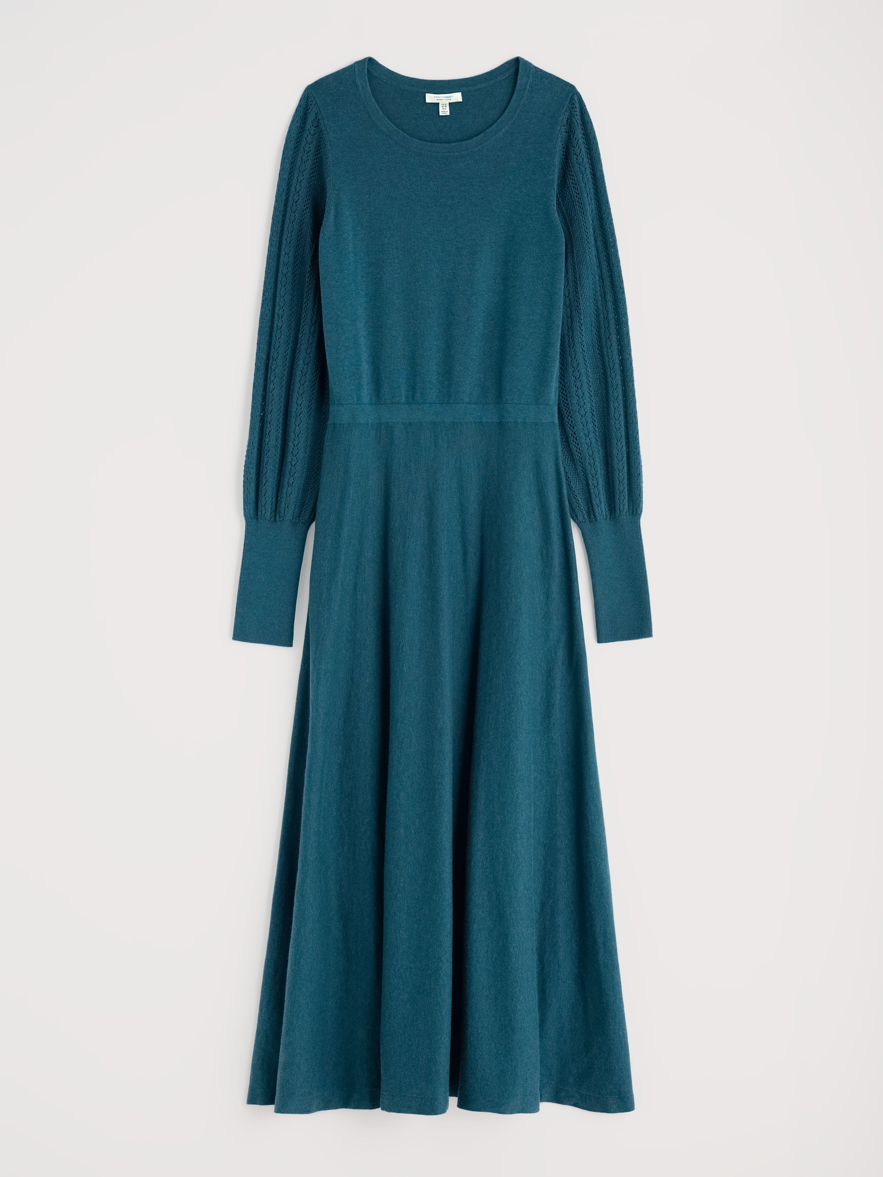 Discover our Herring Gull knit dress in onyx - an eye-catcher for every occasion! Made from soft, GOTS-certified organic cotton, it offers you comfort and sustainability. The fitted design with a flared, calf-length skirt flatters your silhouette. Blouson sleeves and long ribbed cuffs give an elegant look. Combine it with boots and eye-catching accessories for the perfect outfit!
